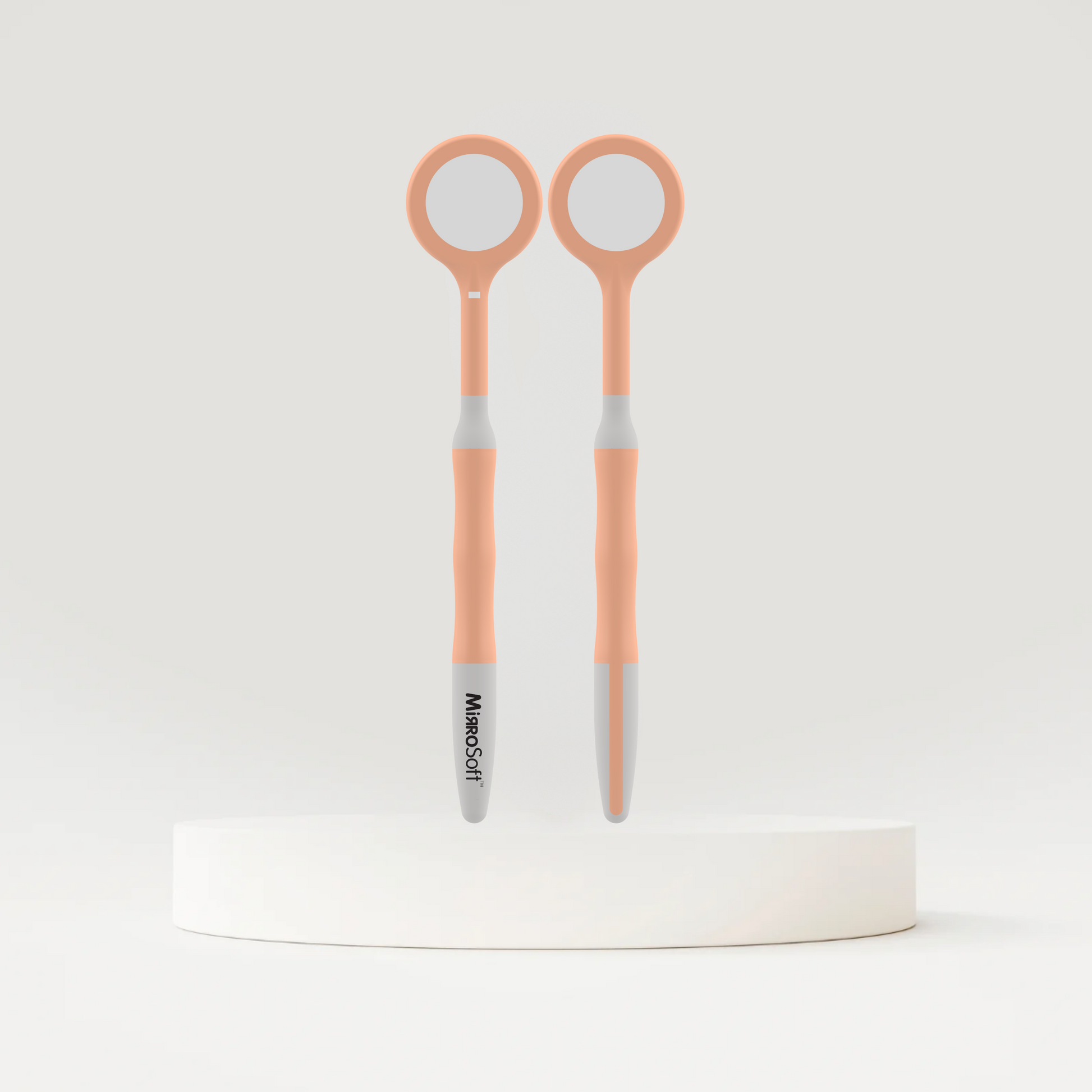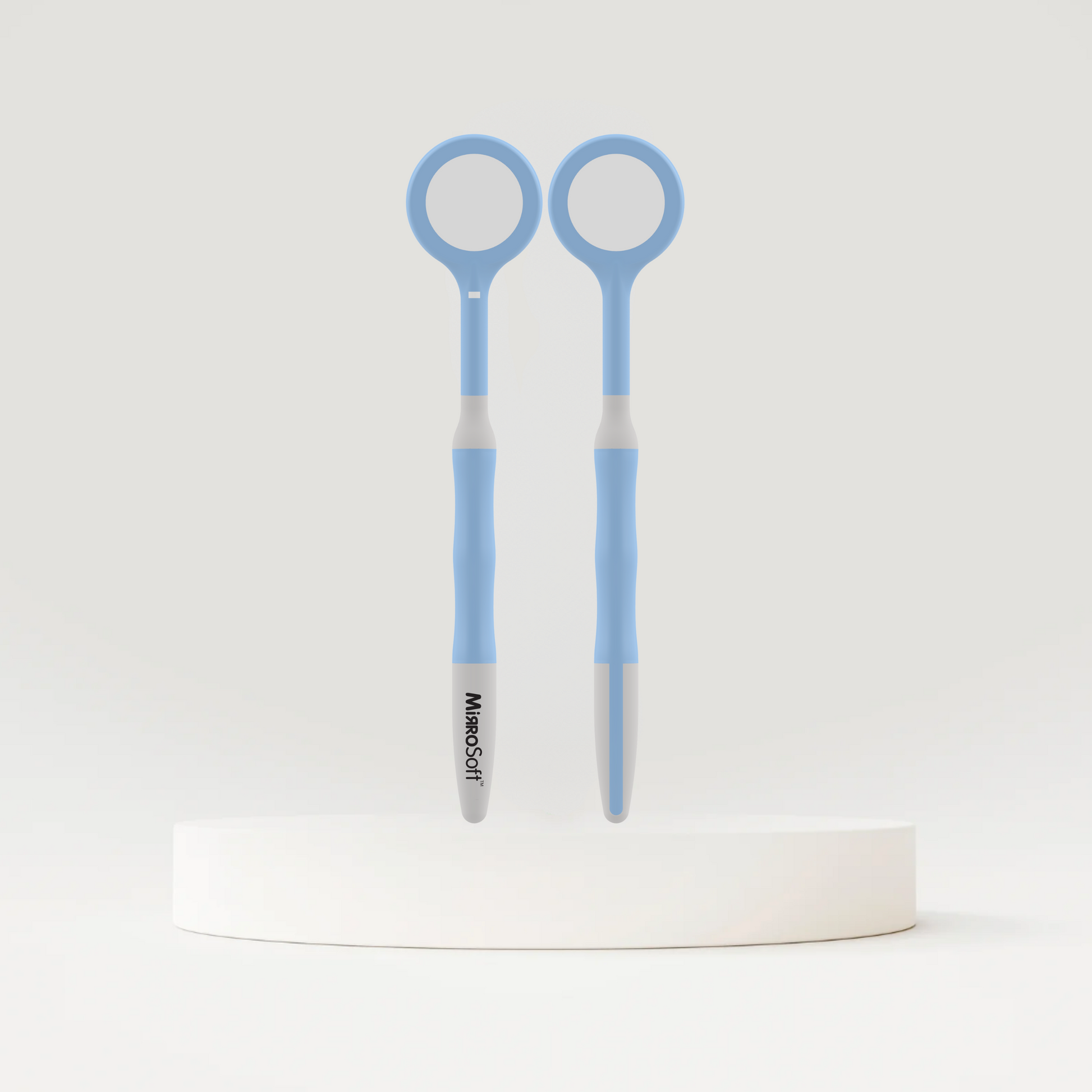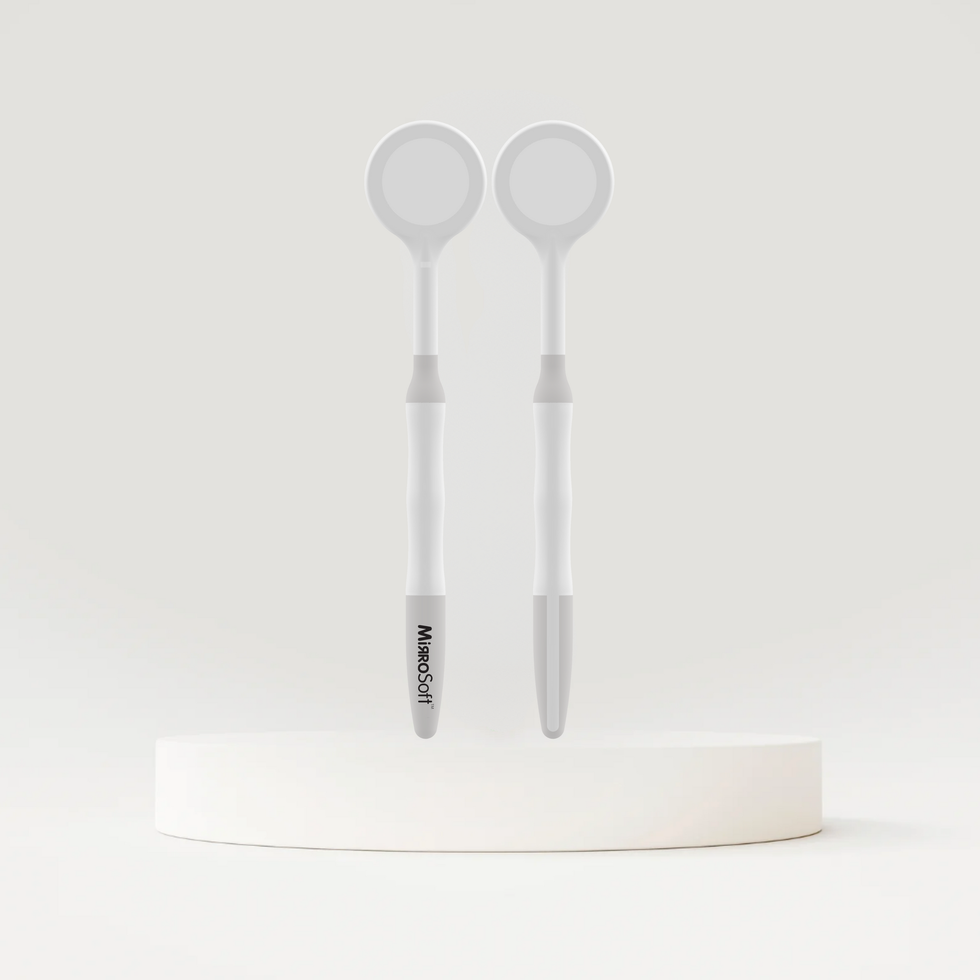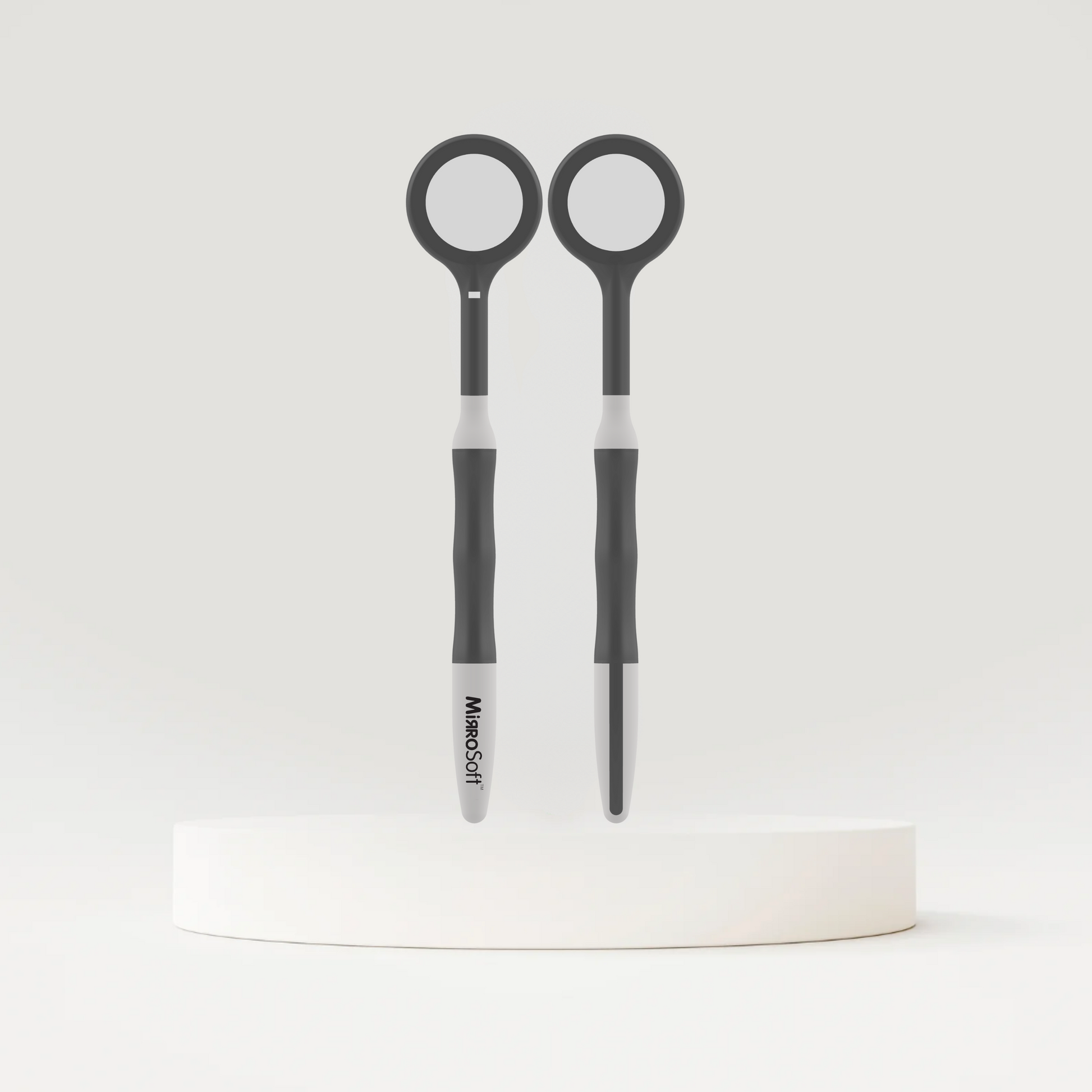 MirroSoft™ Double-Sided #5 is the first dental mirror featuring a soft, bendable neck and unique soft bumper around the perimeter of the mirror lens for comfort. It features a slip-resistant, ergonomic handle. The lens is HD (high-definition), water-repellent, anti-fog, and scratch-resistant.