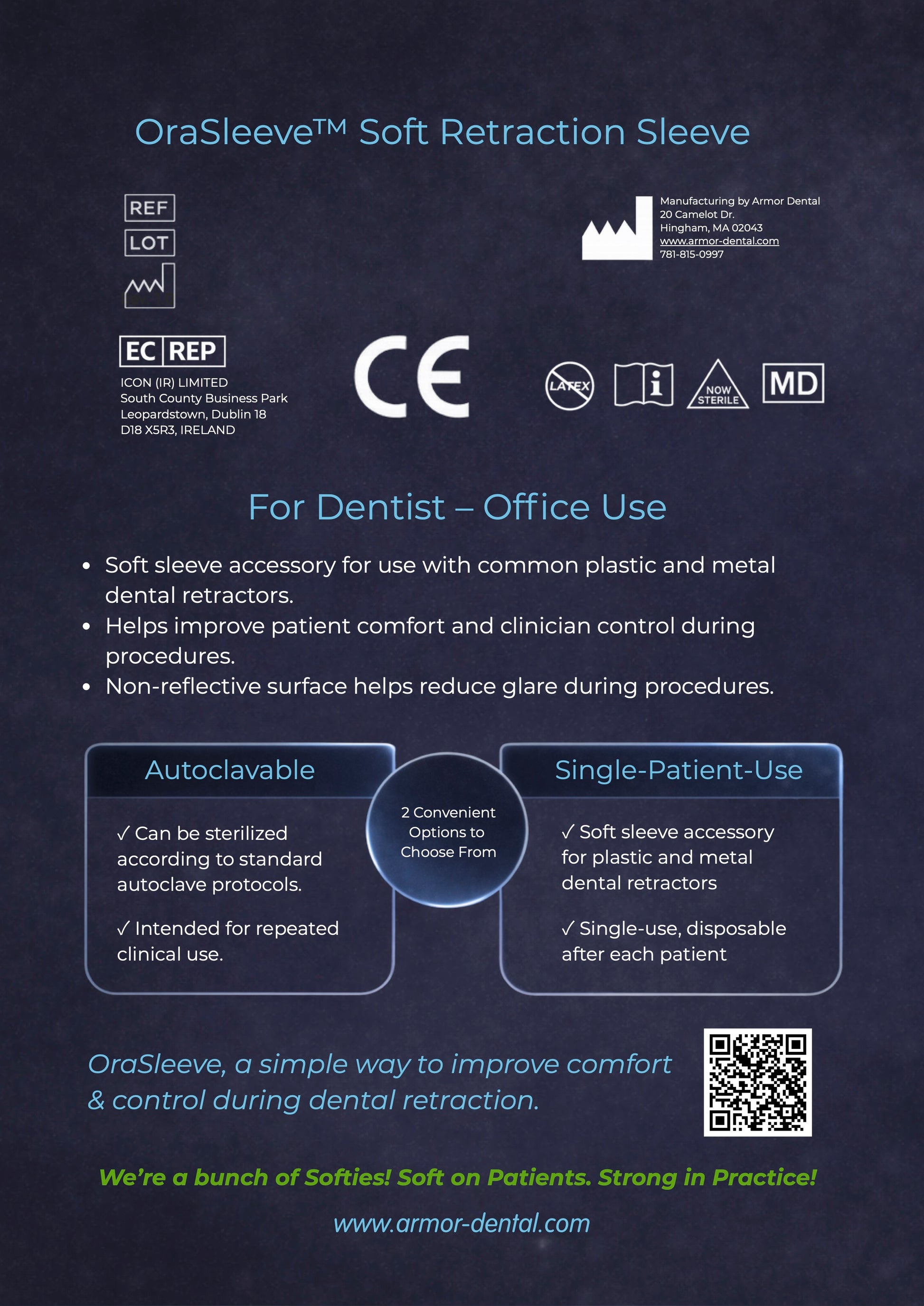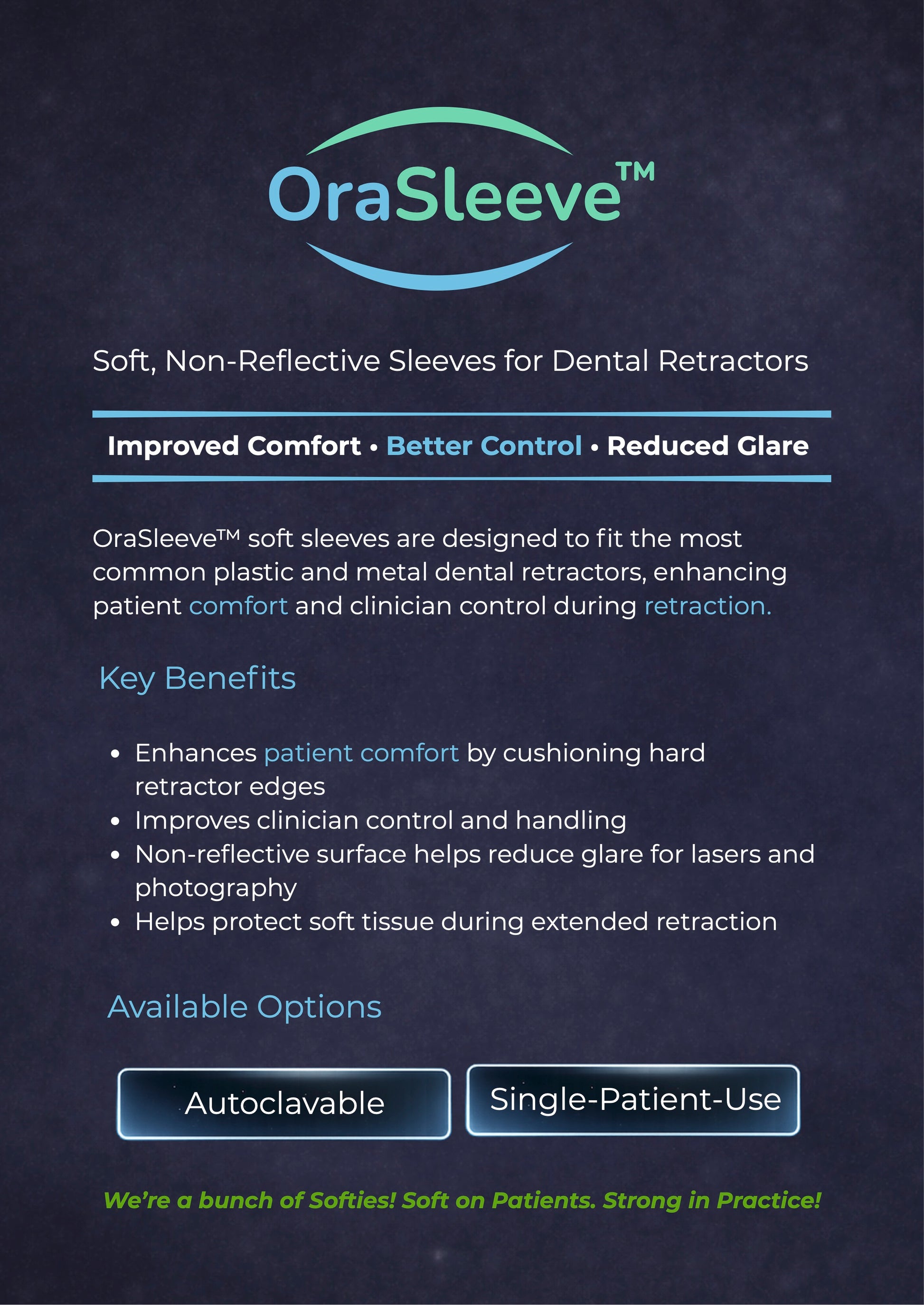 OraSleeve™ soft sleeves are designed to fit the most common plastic and metal dental retractors, enhancing patient comfort and clinician control during retraction.