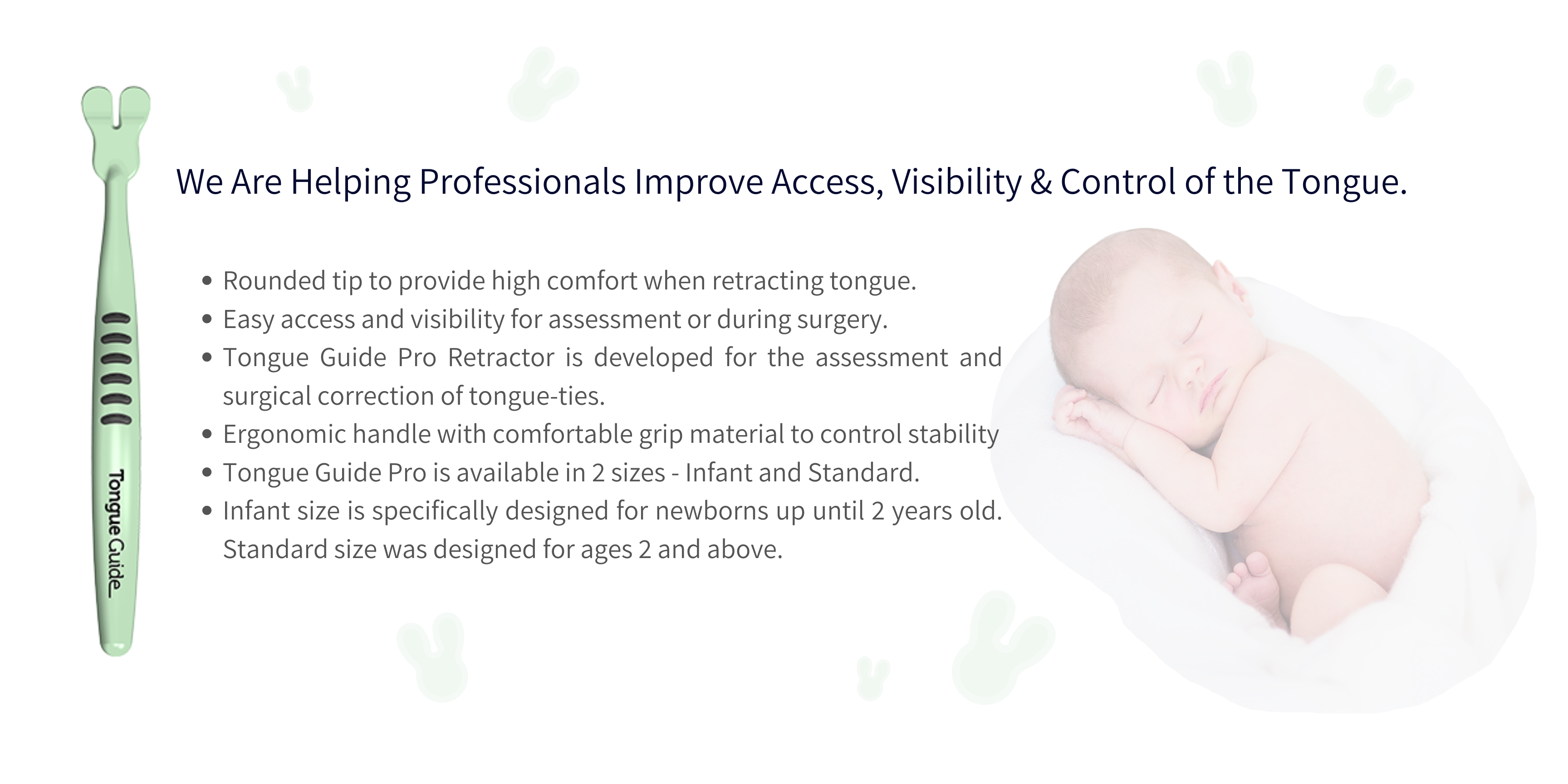 Tongue Guide Infant Pro is the optimal tongue retractor and elevator to improve access, visibility, and control when assessing, diagnosing, and performing surgical procedures of tongue ties.
